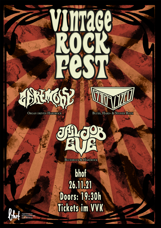 Come together and celebrate with us Würzburgs first Vintage Rock Fest with Jail Job Eve, Paralyzed and Zeremony, 01.07.2022 in B-Hof, Würzburg.