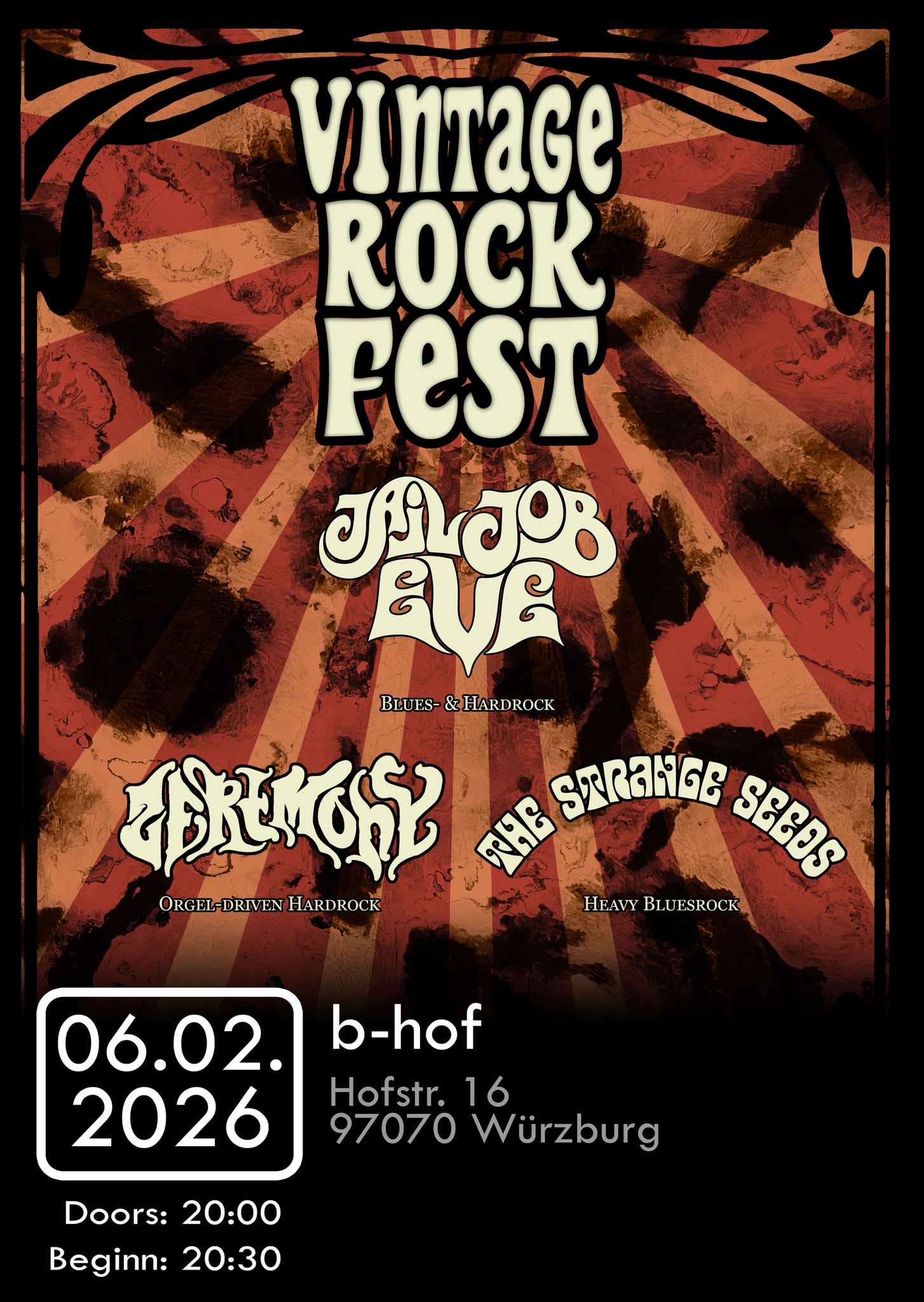 We’re kicking off the year with our first gig: The Vintage Rock Fest on February 6, 2026 at B-Hof Würzburg! We’re looking forward to an evening full of vintage rock with The Strange Seeds and Jailjob Eve.